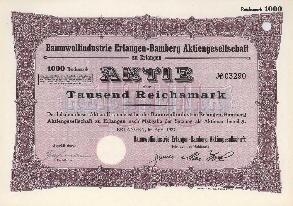 B-65896Baumwollindustrie Erlangen-Bamberg AG-2Erlangen19271 azione da 1.000 MarchiR2 (1001-5000 pezzi)S3 (da 51 a 100 €)