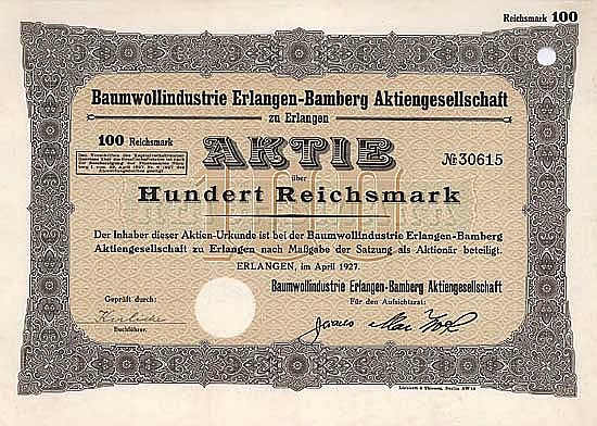 A-65896Baumwollindustrie Erlangen-Bamberg AG-1Erlangen19271 azione da 100 MarchiR2 (1001-5000 pezzi)S3 (da 51 a 100 €)