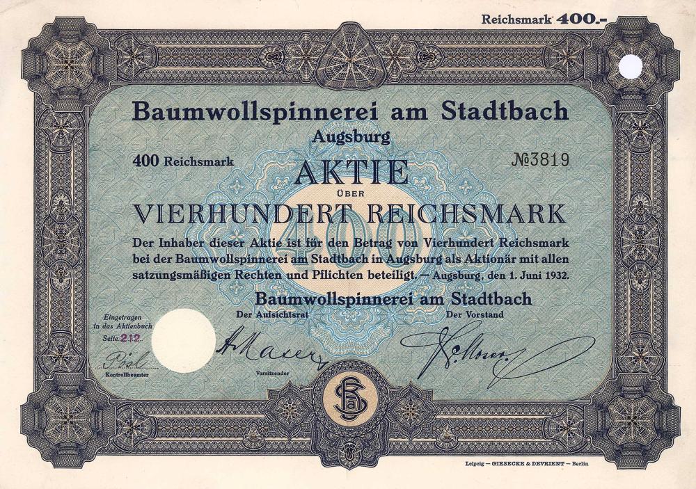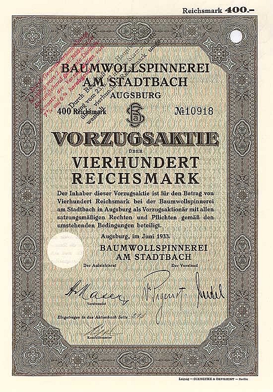 Fondata nel 1851. Fabbricazione di filati semplici grezzi: filati di cotone, filati di rayon, filati di misto cotone e filati di fiocchi. Impianti di Stadtbach, Wertach e Senkelbach. Christian Dierig AG nella Slesia di Langenbielau è un importante azionista dal 1929. Dopo la guerra, la società si trasferì ad Augusta (oggi: Dierig Holding AG) e nel 1951 il cotonificio di Stadtbach fu completamente integrato.
