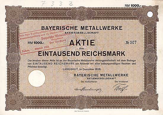 A-65929Bayerische Metallwerke-1Landshut19281 azione da 1.000 Marchi--