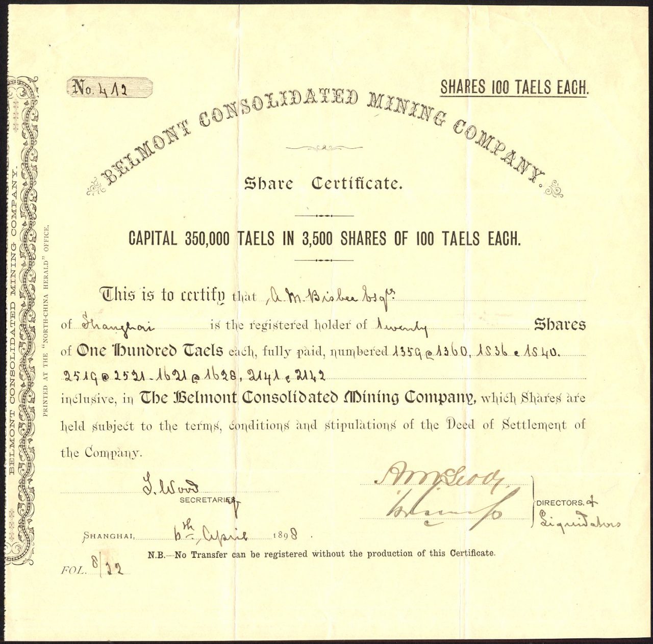 Incorporato a Shanghai. Capitale 350.000 taels in azioni da 100 taels ciascuno
