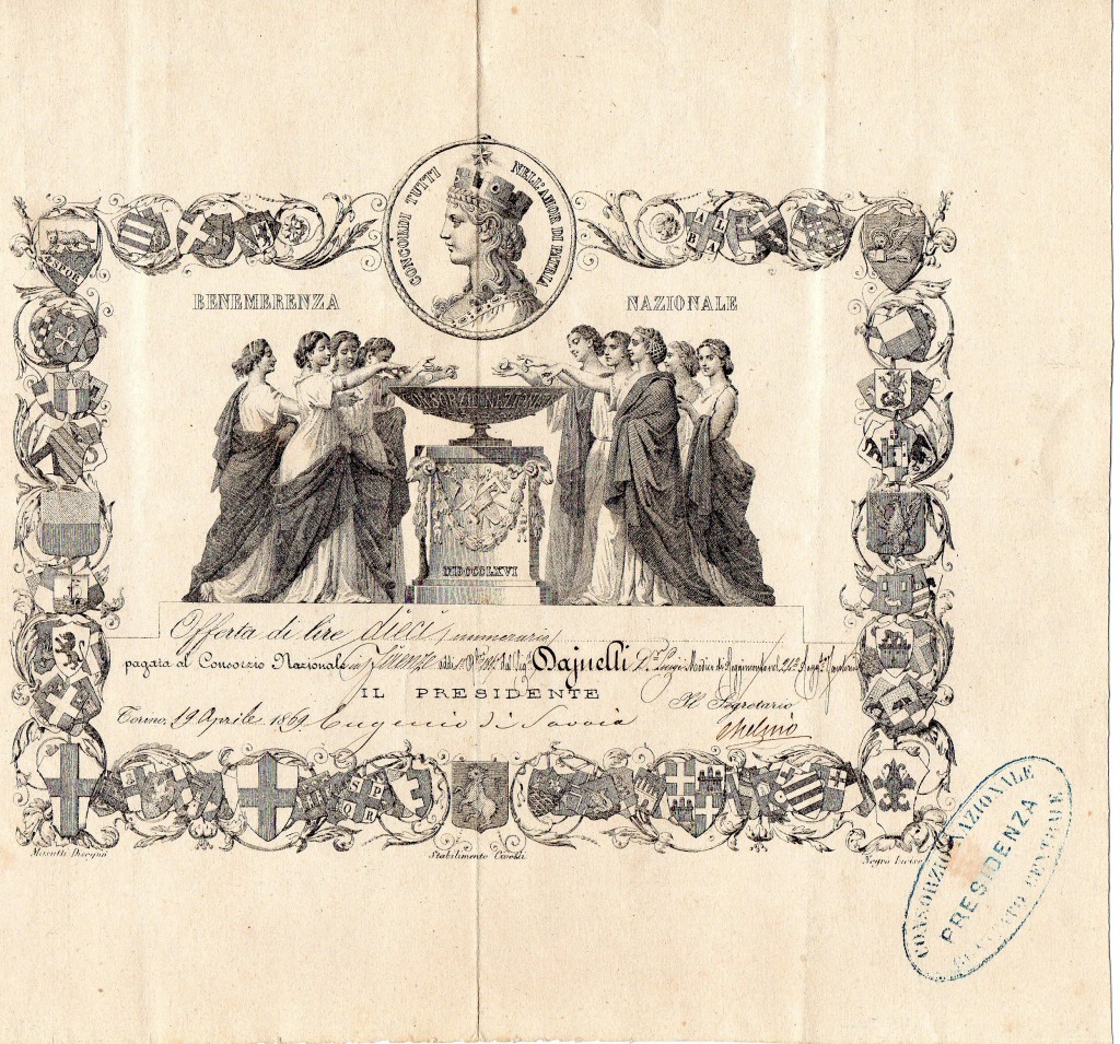 A-40718BENEMERENZA NAZIONALE A FIRMA DI EUGENIO DI SAVOIA-1Torino1867Offerta da L.10--