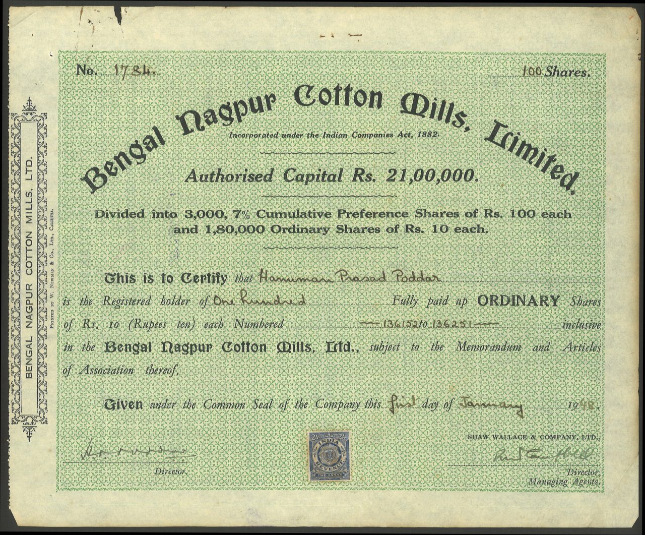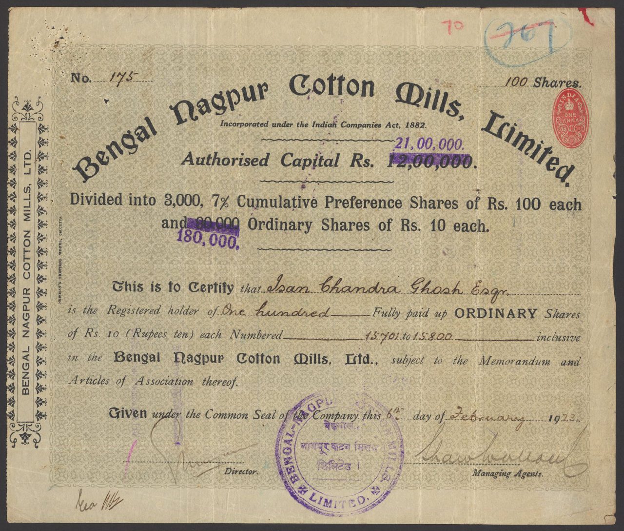 Incorporato ai sensi dell’Indian Companies Act 1882. Capitale 12.00.000 rupie in 90.000 azioni ordinarie da 10 rupie e 3.000 azioni privilegiate cumulative al 7% di 100 rupie. Aumentato intorno al 1923 a 21.00.000 rupie con l’aggiunta di ulteriori 90.000 azioni di 10 rupie.