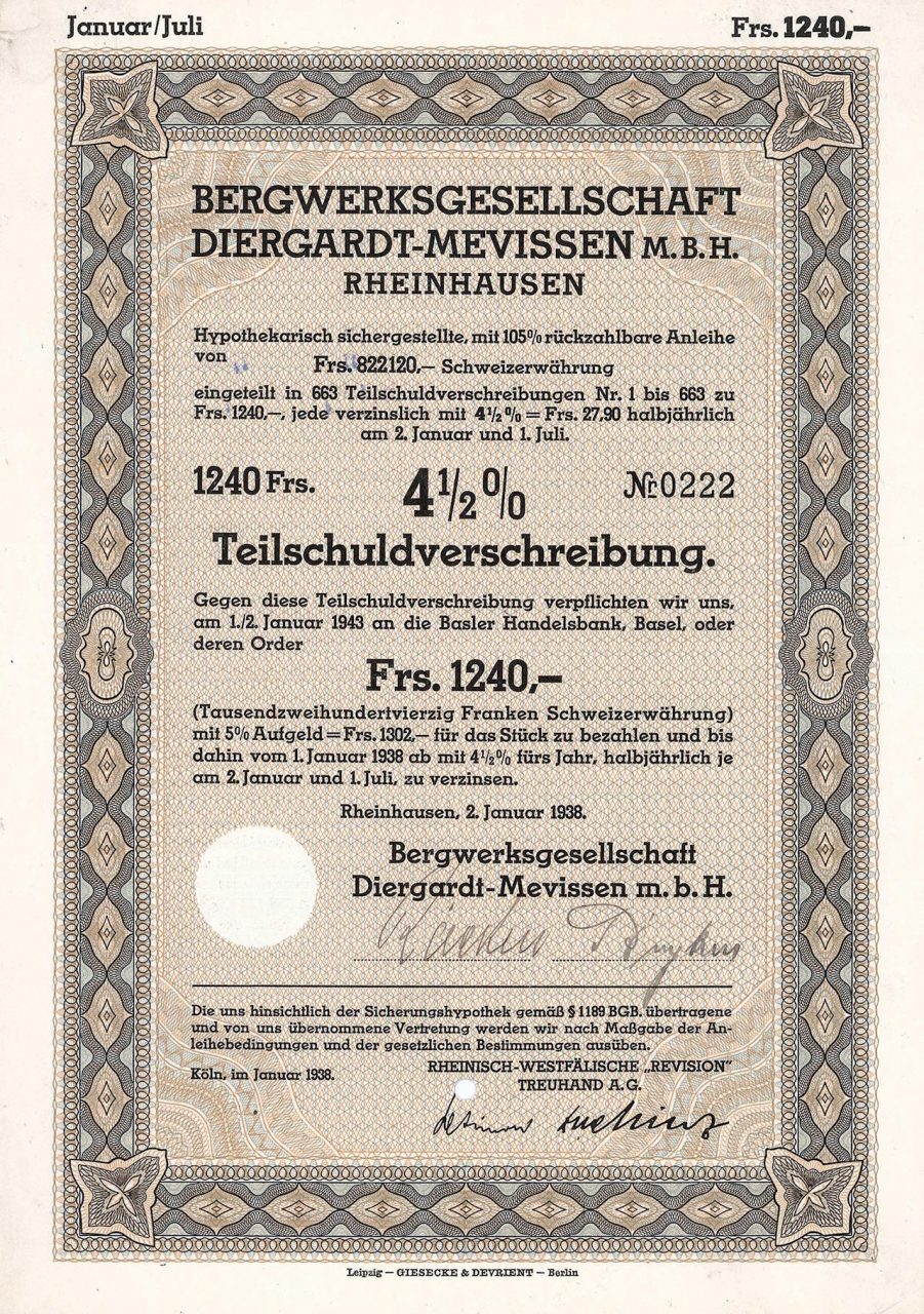 La miniera di carbone duro Wilhelmine Mevissen (unione di diritto minerario dal 1903) fu creata nel 1872 dividendo il campo del campo minato di Diergardt. Dal 1912 fu affondato un sistema a doppio albero, che entrò in produzione nel 1914 con 600.000 tonnellate all'anno. I campi di fossa rivolti a ovest di Fritz a Rumeln e Tellus II furono inoltre acquisiti nel 1924 e nel 1927. Nel 1927 l'unione di Wilhelmine Mevissen e la miniera di Diergardt si fondono per formare la società mineraria Diergardt-Mevissen mbH, con sede a Rheinhausen. Nel 1945 la Wehrmacht demolisce la miniera, ricostruita fino al 1949. Conversione del 1952 in Diergardt-Mevissen Bergbau-AG (il cui principale azionista era la miniera di carbone duro Mathias Stinnes AG). Nel 1968 si fonde nella ... Altro