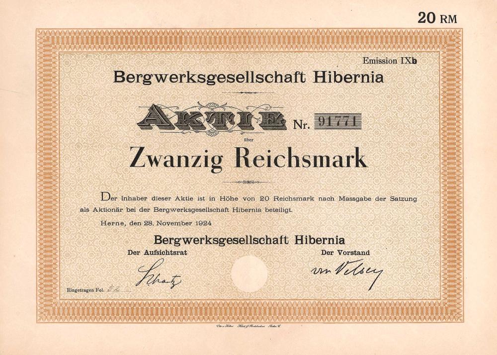 Il sindacato Hibernia (latino per l’Irlanda), fondato nel 1854, fu fondato dal grande pioniere minerario della Ruhr William Thomas Mulvany, originario dell’Irlanda. Anche i mestieri erano quasi esclusivamente irlandesi. Nel 1855 grandi campi furono acquisiti vicino a Bochum e incorporati nel sindacato Shamrock appena fondato (nome irlandese per shamrock, lo stemma irlandese). Entrambe le società furono inserite nella “Hibernia and Shamrock Mining Company” nel 1873, di cui Mulvany rimase presidente fino alla sua morte nel 1885. Nel 1887 cambio del nome in “Bergwerksgesellschaft Hibernia”. Una delle più importanti società minerarie della zona in assoluto. Nelle miniere Hibernia, Shamrock I-IV, Wilhelmine-Victoria (tutte a Gelsenkirchen), Schlägel e Eisen (vicino a Recklinghausen), General Blumenthal I-IV e Alstaden, 25.000 lavoratori a volte estraevano fino a 6 milioni di tonnellate di carbone all’anno. Inoltre cokerie, centrali elettriche proprie, murature, fabbriche chimiche. Dal 1902, per ragioni strategiche, lo stato prussiano iniziò ad acquisire proprietà minerarie nell’area della Ruhr. Nel 1904 la Prussia aveva una stretta maggioranza delle azioni di Hibernia, che suscitò l’ira esuberante dei baroni. Le assemblee generali straordinarie del 1904 e del 1906 riportarono lo stato prussiano a una posizione di minoranza con gli aumenti di capitale decisi lì, esclusi i diritti di sottoscrizione degli azionisti. Il processo è passato alla storia finanziaria come la “battaglia di Hibernia”. Alla fine, tuttavia, lo stato ha prevalso: nel 1917 il parlamento statale prussiano ha approvato una legge che autorizzava il governo statale a rilevare tutte le azioni di Hibernia detenute da terzi. Il governo ha rotto la resistenza dell’economia stabilendo un giunto con l’approvazione del rinnovo della Rheinisch-Westfälische Kohlen-Syndikat. Il vecchio consiglio di sorveglianza si è quindi dimesso dalla carica. Ben presto lo stato di Prussia possedeva oltre il 99% delle azioni di Hibernia attraverso la United Electricity and Mining Company (VEBA) e nel 1926 fuse le miniere di Hibernia con le miniere fiscali dell’ex direzione mineraria statale a Recklinghausen (1935 poi fuse con la compagnia mineraria AG Recklinghausen). Dopo la seconda guerra mondiale, la società mineraria Hibernia AG fu ristabilita nel 1954 con i beni della vecchia AG e le azioni della Emscher-Lippe Bergbau-AG, e nel 1957 fu rilevata l’unione del principe ereditario tedesco. L’investimento più importante è stato Scholven-Chemie AG a Gelsenkirchen-Buer. Il governo federale ha continuato ad essere l’unico azionista indirettamente tramite VEBA. Nel 1970 le miniere entrarono a far parte della Ruhrkohle AG.