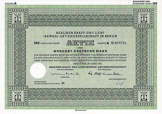 Originariamente fondata nel 1884 come "Städtische Elektricitäts-Werke AG" dalla tedesca Edison Society for Applied Electricity (in seguito ribattezzata AEG). Dal 1923 la stessa "Berliner Städtische Elektrizitätswerke AG" (Bewag). Durante la crisi economica globale, Berlino, che era già finanziariamente debole, si trovava in una situazione quasi senza speranza e aveva urgentemente bisogno di denaro. Dopo aspre controversie politiche, Bewag fu infine venduto nel 1931 per 560 milioni di RM al neo fondato Berliner Kraft- und Licht-AG (Bekula). Le loro azioni A (2/3 del capitale) sono state acquisite da un consorzio internazionale di investitori con investimenti tedeschi, belgi, americani, inglesi, svizzeri, olandesi, scandinavi e italiani. Quasi il 48% delle azi... Altro