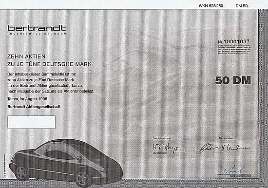 Fondata nel 1974 come studio di ingegneria, Bertrandt GmbH dal 1993, convertita in AG nel 1996. Vengono forniti ingegneria e servizi, in particolare progettazione, sviluppo, costruzione e fabbricazione di prototipi per l’industria automobilistica.