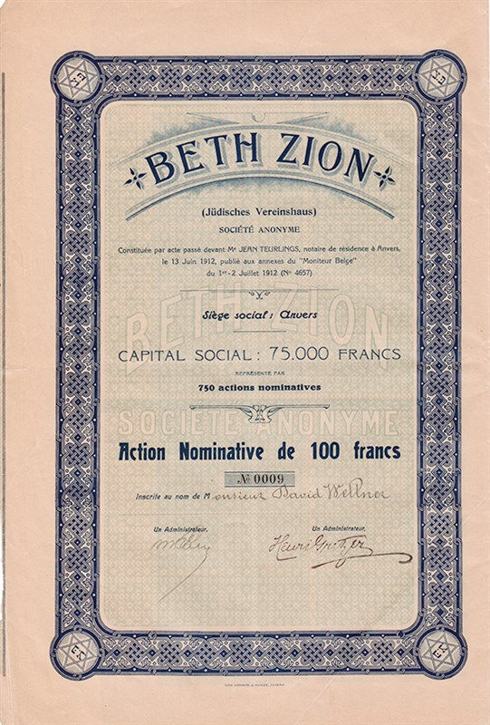 La società, creata nel 1912, finanziava e organizzava attività culturali, sportive e ricreative per la comunità ebraica di Anversa, in Belgio. Promosse inoltre l’apertura di palestre, sale da biliardo, biblioteche, bar e ristoranti. Il capitale sociale fu diviso in sole 750 azioni.