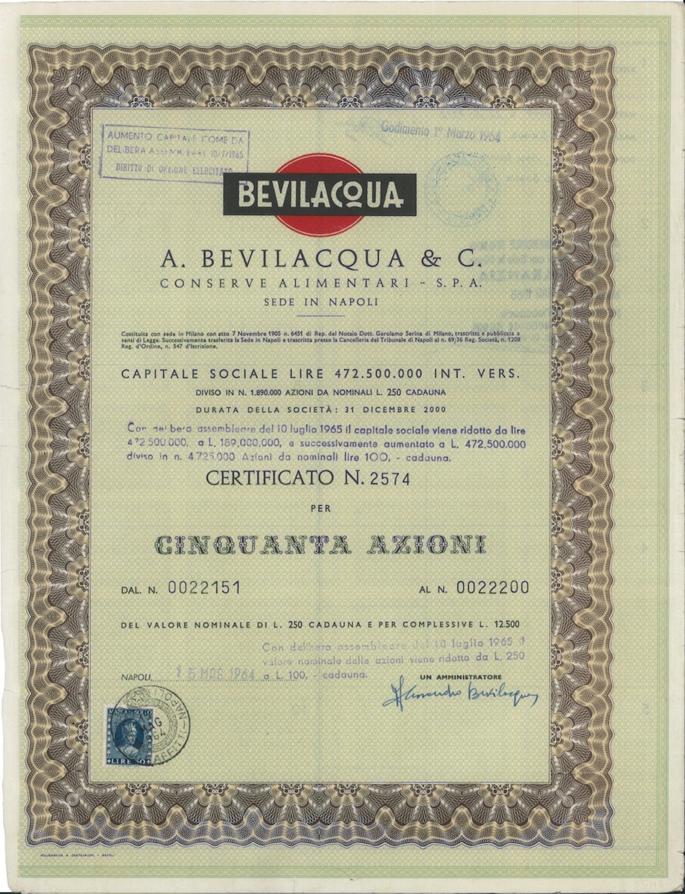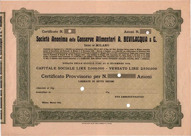 La fabbrica lombarda di conserve alimentari nacque a Milano nel 1905 e successivamente trasferì la sede a Napoli modificando la ragione sociale in A. Bevilacqua & C. – Conserve Alimentari SpA. Fu posta in liquidazione nel 1967.