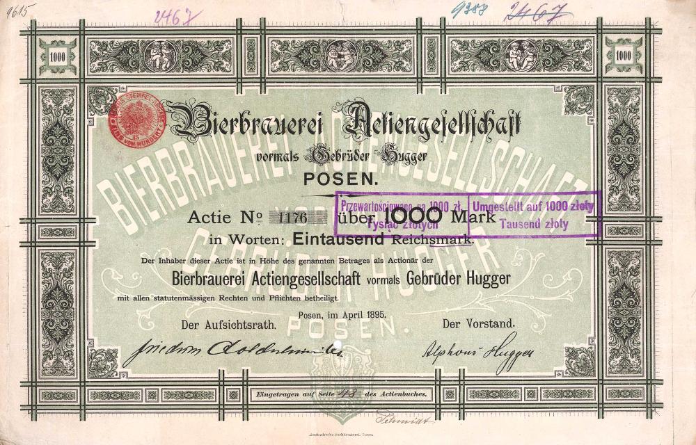 A-63390Bierbrauerei AG vormals Gebrüder Hugger Posen-1Posen18951 azione da 1.000 MarchiR4 (251-500 pezzi)S4 (da 101 a 250 €)