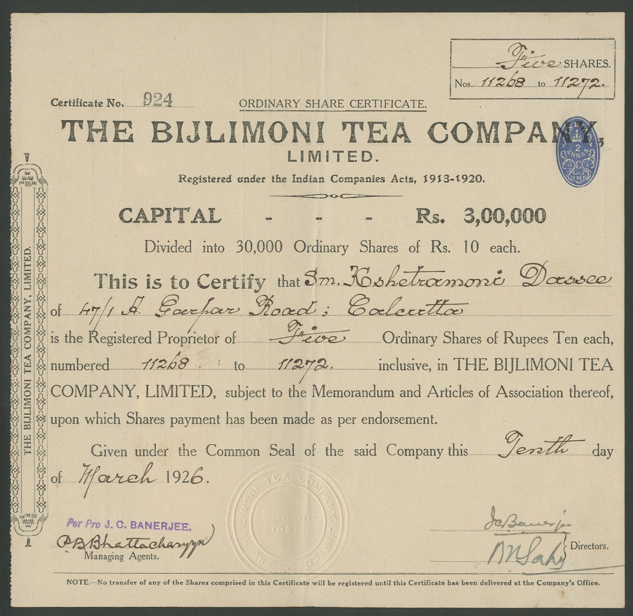 Capitale 3.000.000 di rupie in 30.000 azioni ordinarie di 10 rupie