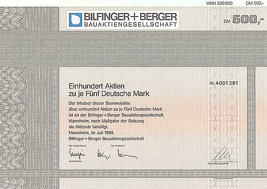 La società di costruzioni Mannheim Grün + Bilfinger è stata fondata nel 1880, dal 1906 AG. Con l’aiuto del principale azionista congiunto Dresdner Bank, il “Grünfinger” (da cui il nome sintetico) ha acquisito la maggioranza della Julius Berger-Bauboag AG, Wiesbaden (ex Berlino) nel 1970. Nel 1975 si fonde poi in Bilfinger + Berger Bauaktiengesellschaft. Oggi è anche il secondo gruppo di costruzioni tedesco di maggior successo a livello internazionale, il cui CEO nel 2011 è stato l’ex primo ministro dell’Assia Roland Koch.