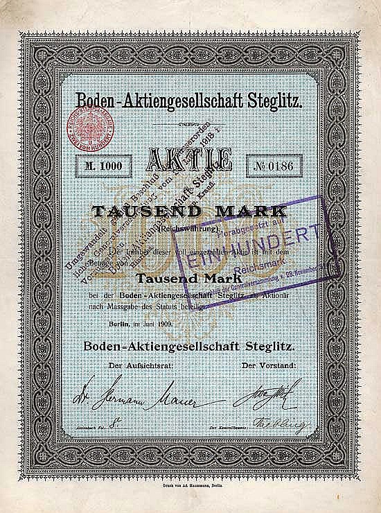 A-71785Boden-AG Steglitz-1Berlino19091 azione da 1.000 Marchi--