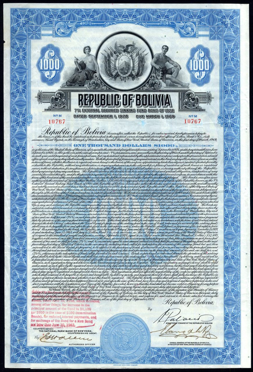 A-33470Bolivia: 7% External Secured Sinking Fund Bonds 1928-1Bolivia1928$1000R2 (1001-5000 pezzi)S3 (da 51 a 100 €)