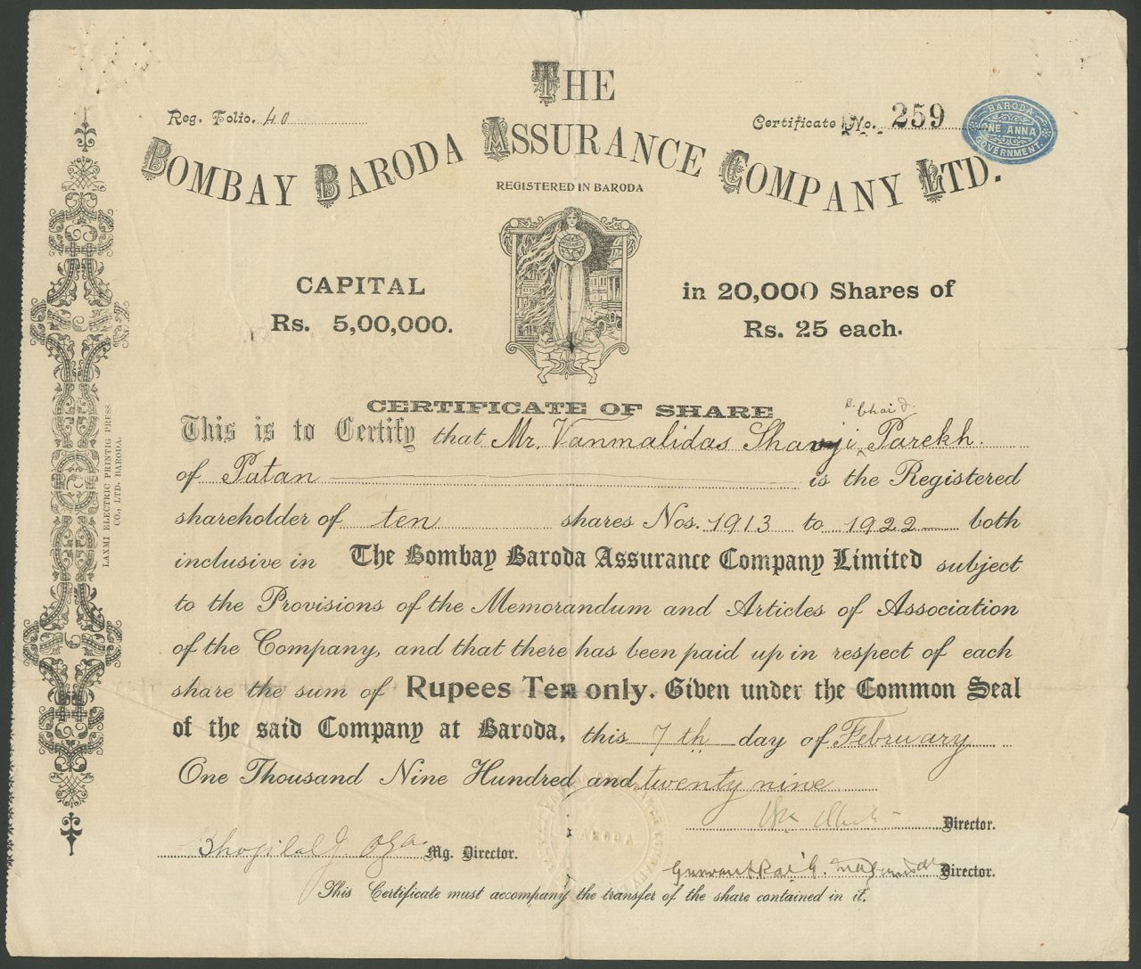 Incorporato a Baroda prima del 1929. Capitale 5.000.000 di rupie in azioni di 25 rupie