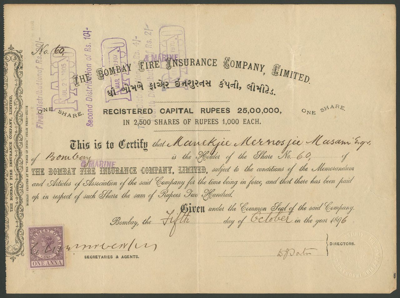 A-38177Bombay Fire Insurance Company Limited-1British India18961 shareR2 (1001-5000 pezzi)S2 (da 26 a 50 €)
