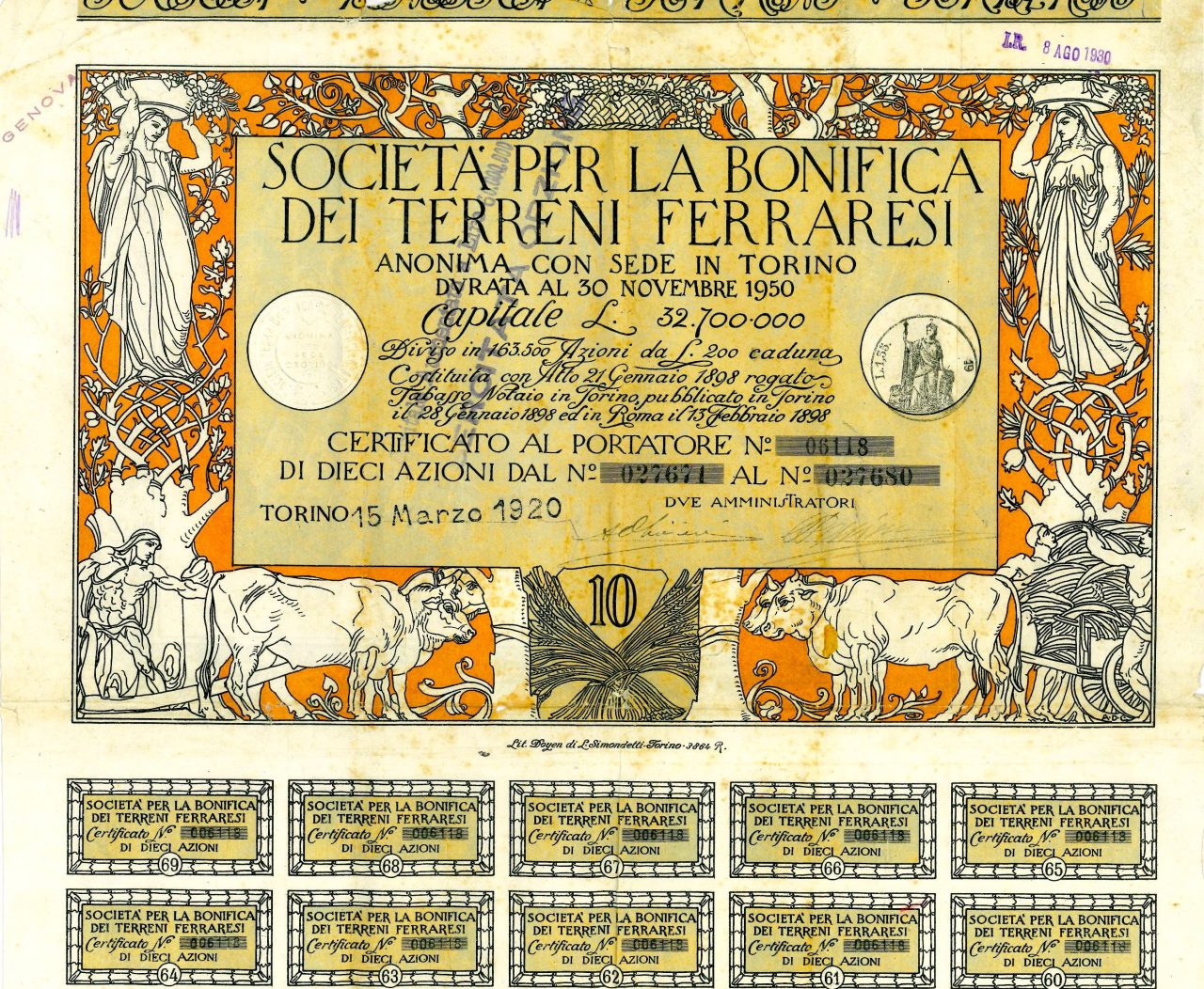 I certificati presentano un raffinato design in stile Liberty, arricchito da decorazioni floreali e figure allegoriche che simboleggiano l’agricoltura e la fertilità della terra. Questo particolare disegno è opera di Adolfo De Carolis, uno dei più importanti illustratori e artisti italiani dell’epoca. De Carolis, noto per le sue opere simboliste e Liberty, fu un artista e incisore influente, contribuendo significativamente all’arte grafica italiana del primo Novecento. Le sue opere sono caratterizzate da un forte senso di classicismo e simbolismo, spesso integrando elementi mitologici e allegorici che conferivano ai suoi disegni una profonda dimensione narrativa e estetica.