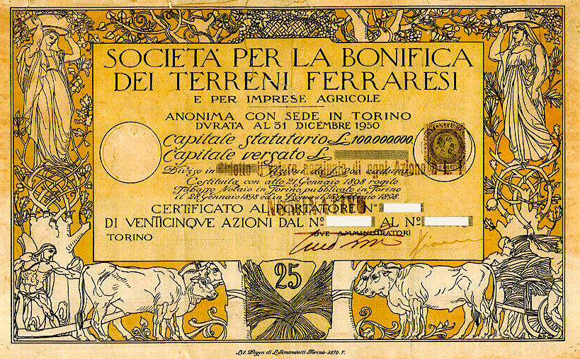 G-7265Bonifica dei Terreni Ferraresi e per Imprese Agricole Soc. per la-1-Torino192010 azioni al portatore da Lire 200--