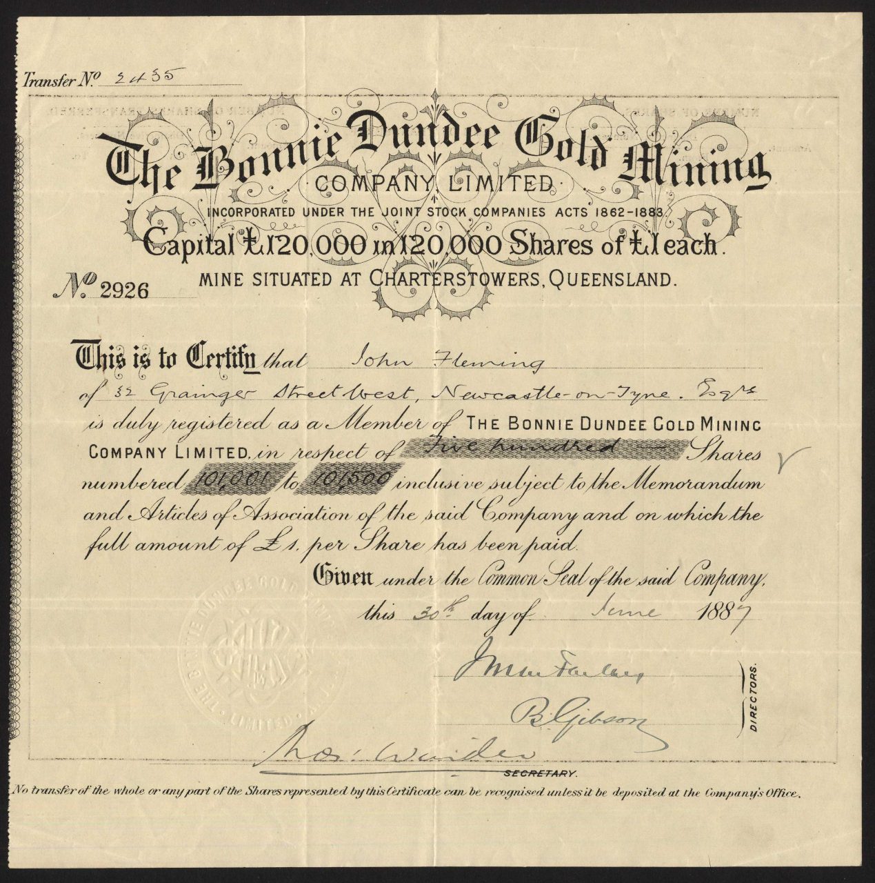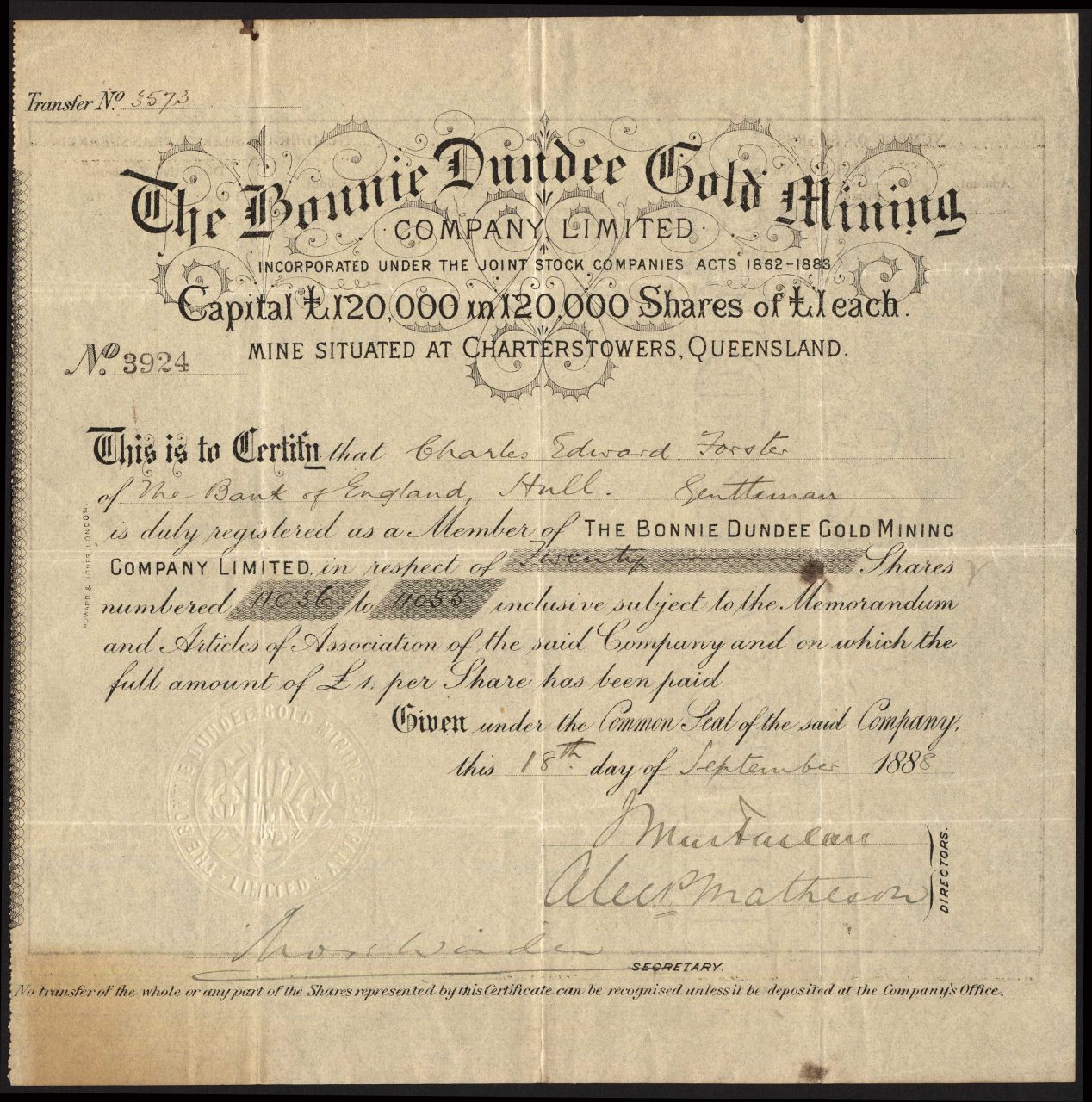 Registrato nel 1886. Dissolto <1916. Azienda numero 23187. Miniere presso Charters Towers, Queensland.