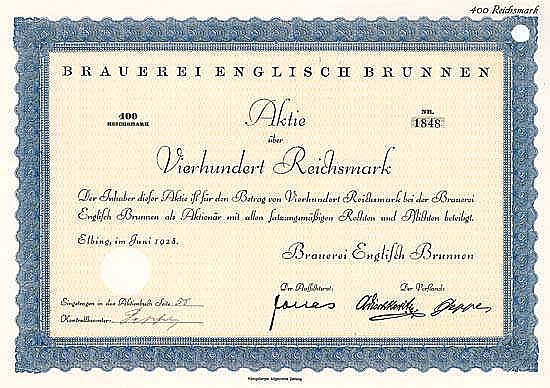 Fondata nel 1880. Produzione di birra ad alta e bassa fermentazione. Marche: Elbinger Pilsener, Elbinger Porter, Elbinger Hell; anche produzione di birra export, birra bock, birra caramellata, birra di frumento, birra al malto, acqua minerale e limonate. Nel 1948 si trasferì ad Amburgo, nel 1969 si è fusa con Ferd. Rückforth Successor AG, Siegburg, Rhld (oggi a Colonia). L’ex birrificio Elbinger, chiamato Englischer Brunnen, ha operato nuovamente come Elbrewery Co. Ltd. da circa un decennio. La birra con il marchio EB è uno dei tipi di birra più popolari in Polonia e appartiene al gruppo olandese Heineken.