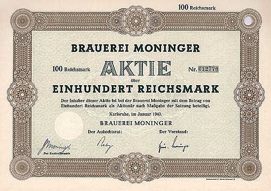 Le origini del birrificio risalgono al 1856, dal 1889 AG. Nel 1939 Cambio di nome in Brauerei Moninger AG. Nel 1920 viene fondata la fabbrica di birra Eglau a Durlach, nel 1922 si fonde con la fabbrica di birra Union a Karlsruhe. Nel 1970 acquisizione del birrificio Huttenkreuz AG di Ettlingen, nel 1971 acquisizione della maggioranza delle azioni della Sinner AG di Karlsruhe. Quotazione della borsa di Francoforte Freiverkehr. La famiglia Moninger, Badische Bank e Henninger-Bräu sono stati i principali azionisti per lungo tempo. Negli anni '60, la fabbrica di sigarette Reemtsma di Amburgo fece anche una breve apparizione come principale azionista. All'inizio degli anni '90, la Stuttgarter Hofbräu AG ha acquisito oltre l'80% delle azioni. Con poco più di 100 d... Altro