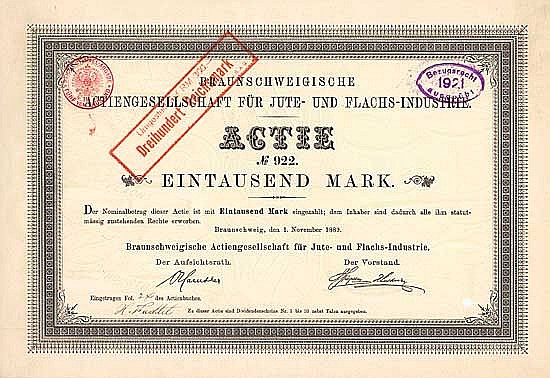 A-66138Braunschweigische AG für Jute-und Flachs-Industrie-1Braunschweig18891 azione da 1.000 Marchi--