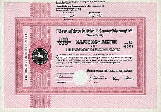 L’origine è la “Braunschweigische Allgemeine Prediger- und Schullehrer-Wittweninstitut”, fondata nel 1806 (nel 1823 trasferita all’Allgemeine Widwen-Versorgungsanstalt). Dal 1902 come “Braunschweigische Lebens-Versicherungs-Anstalt” un’associazione di mutua assicurazione. Nel 1909 ampliamento dell’attività in tutto il Reich tedesco, nel 1920 il nome diventa “Braunschweigische Lebensversicherungs-Bank AG”, dal 1937 in poi Braunschweigische Lebensversicherung AG. La Brandenburger Lebensversicherungs-AG di Berlino fu rilevata nel 1939 e nel 1940 la Vereinigte Mitteldeutsche Lebens-Versicherungs-Ges. a Lipsia. Per lungo tempo l’azionista di maggioranza è stato il Fondo antincendio regionale di Hannover. Nel 1983 si fonde quindi con Hanse-Merkur Lebensversicherungs-AG ad Amburgo.