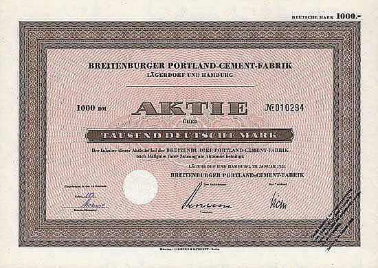 A-71432Breitenburger Portland-Cement-Fabrik-1Lägerdorf und Hamburg19511 azione da 1.000 Marchi--