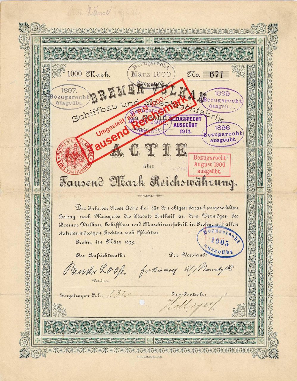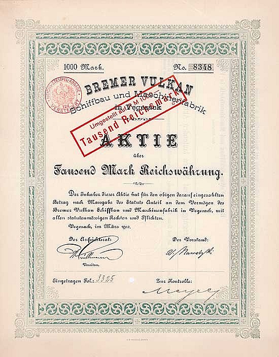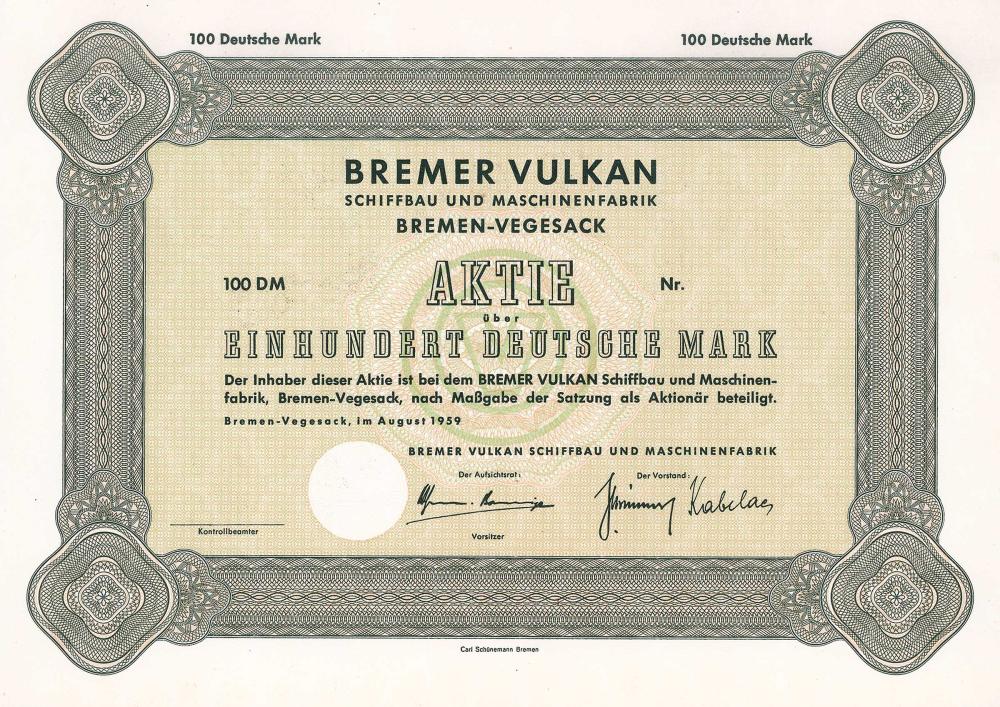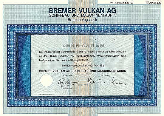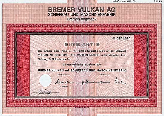 Fondata nel 1893 sotto l’acquisizione di Johann Lange a Grohn vicino Vegesack. Nel 1898 trasferimento del cantiere navale su 33 ettari sulla riva destra del Weser nei distretti Vegesack e Fähr-Lobbendorf con 1,3 km di lungomare. Fino alla fine del secolo, vi era un aumento di capitale quasi ogni anno – inizialmente senza molto effetto, ma successivamente i dividendi sono stati guadagnati fino al 20%. La gloria si affievolì nella crisi dei cantieri navali degli anni ’70: il vulcano Brema recentemente è diventato lo strumento della politica dei cantieri navali del Senato di Brema sotto la guida altamente qualificata di un ex direttore del Senato come presidente del consiglio di amministrazione – tuttavia (o proprio per questo?) vi fu un crollo con miliardi di euro persi.