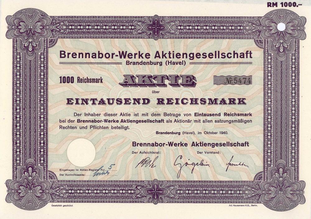 A-74796Brennabor-Werke AG-1Brandenburg19401 azione da 1.000 MarchiR2 (1001-5000 pezzi)S3 (da 51 a 100 €)