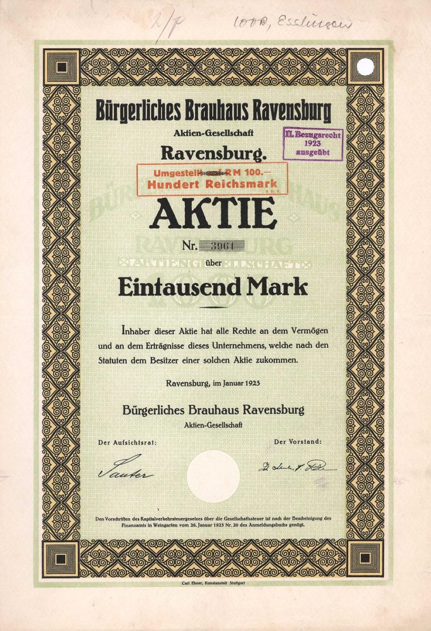 Fondata nel 1903 per acquisire e continuare a gestire il birrificio precedentemente di proprietà della società Mogger & Ruile a Ravensburg. Il birrificio Johann Schuler (1904), il birrificio e il malto “Zur Räuberhöhle” a Ravensburg (1907), il Bergbrauerei vicino a Friedrichshafen (1909), il birrificio “Zum Schützen” a Meersburg (1927) e il birrificio Gambrinus a Weingarten (1930). L’azionista di maggioranza Inselbrauerei Lindau AG ha rilevato il proprio birrificio nel 1972, cambiando contemporaneamente il suo nome in “Bürgerliches Brauhaus Ravensburg-Lindau AG”. La società, che è ancora quotata in borsa, ha assunto circa 70 dipendenti con vendite annue di € 10 milioni, di cui quasi 1/3 da locazione e leasing. Oggi, la maggior parte delle vendite è generata dall’installazione di dispositivi di gioco e intrattenimento e dal funzionamento di sale giochi.