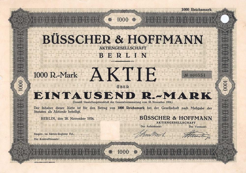 Fondata nel 1852 come oHG, trasformata in GmbH, AG dal 1923. Produttore di feltro per tetti, asfalto e lastre di asfalto, catrame, prodotti di catrame, cartone grezzo e altri materiali da costruzione. Nel 1943 c’erano filiali a Berlino, Breslavia, Eberswalde, Essen, Elbing, Halle (Saale), Königsberg (Pr.), Mainz, Monaco, Norimberga, Regenstauf (Baviera). Nel 1950 acquisizione da parte di F. Joh. Kwizda Chemische Fabrik, Vienna. Oggi Büsscher & Hoffmann GmbH, con sede a Enns, è leader di mercato in Austria per i fogli di bitume e bitume polimero.
