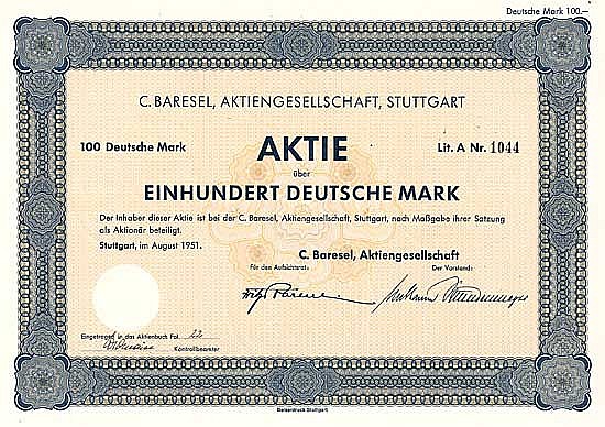 Società di costruzioni fondata nel 1876, convertita nel 1921 nella “Gesellschaft für Tiefbauten AG”, nel 1922 ribattezzata C. Baresel AG. Realizzazione di tutti i tipi di costruzione, ingegneria civile, cemento armato, ponti, gallerie, strade e costruzioni industriali. Produzione di pietre naturali nelle cave e pietre artificiali in impianti di calcestruzzo, nonché estrazione di ghiaia e sabbia. All’inizio del 2006 la conversione in una GmbH, oggi circa 400 dipendenti hanno realizzato un fatturato annuo di 220 milioni di euro.