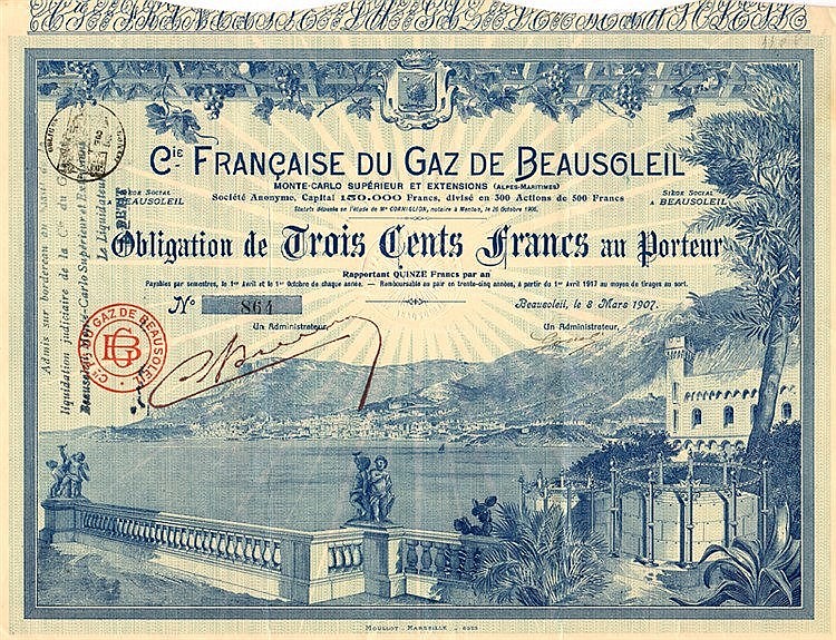 Magnifico documento con attraente panorama di Montecarlo con le Alpi Marittime sullo sfondo. La compagnia, infatti, provvedeva alla distribuzione del gas a Montecarlo superiore e zone limitrofe.