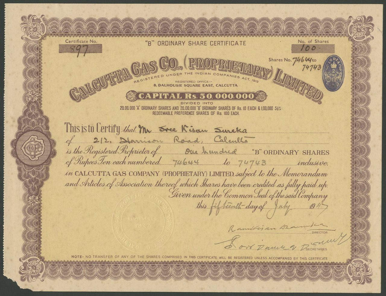 Capitale 50.000.000 di rupie in 20.000.000 di azioni ordinarie “A” e 20.000.000 di azioni ordinarie “B” di 10 rupie e 1.00.000 azioni privilegiate rimborsabili al 5½% di 100 rupie.