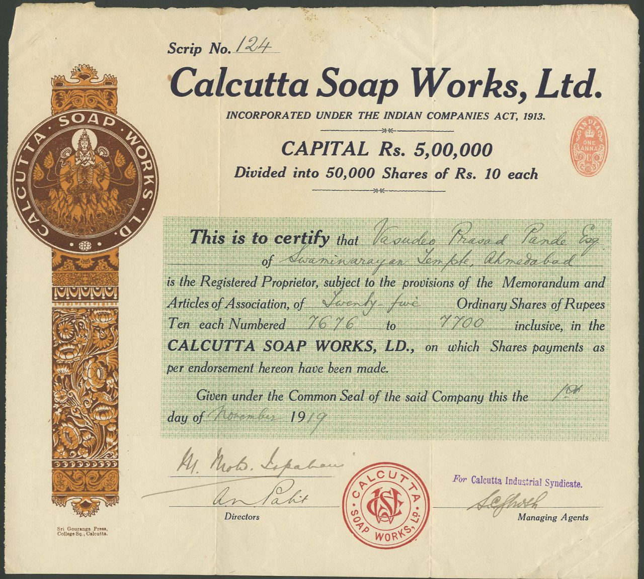 Incorporato sotto gli Indian Companies Acts del 1913. Sede a Calcutta. Capitale 5.000.000 di rupie in azioni di 10 rupie.
