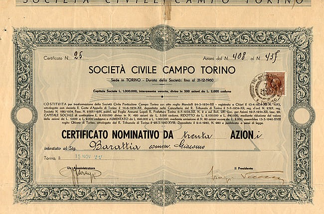 Veduta di un campo da calcio in toni sfumati sullo sfondo. Fu costituita nel 1934 per trasformazione della Società Civile Particolare Campo Torino con un capitale di Lire 1.000.000 diviso in 500 azioni.