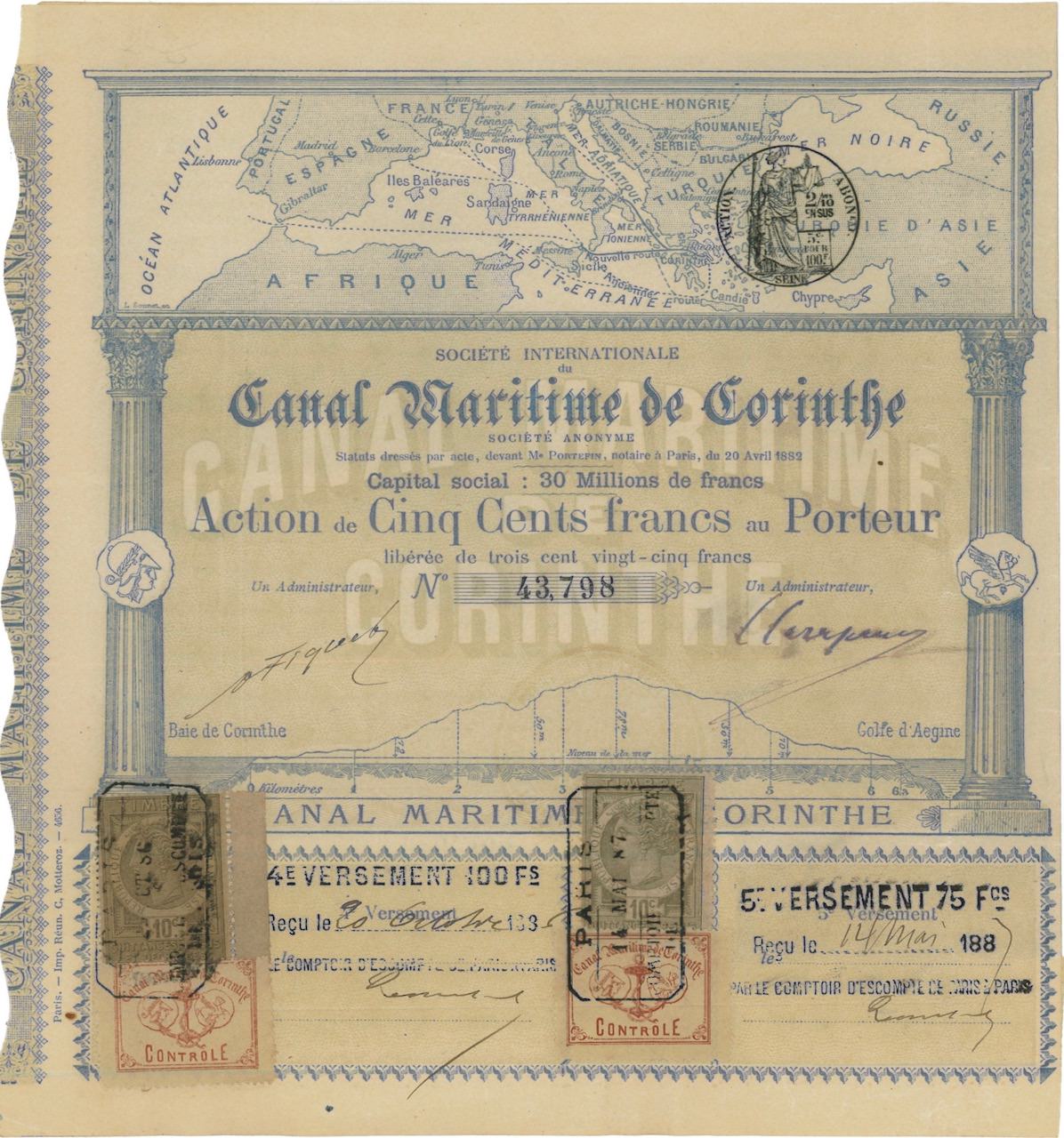 L’istmo di Corinto è un istmo naturale largo solo 6 km tra la Grecia settentrionale e il Peloponneso. Già nell’antichità (ad esempio con Nerone) lo sfondamento tra il Golfo di Corinto e il Golfo di Egina fu pianificato più volte. Nel 1881-82 lo iniziò la Soc. Internationale du Canal Maritime de Corinthe S.A. con la costruzione del canale. La Soc. L’Hellénique du Canal de Corinthe continuò i lavori dal 1890 dopo che la società precedente rimase senza soldi. Il canale è stato aperto nel 1893. La successiva compagnia di soccorso fu Nouvelle S.A. du Canal de Corinthe poco dopo il 1900.
