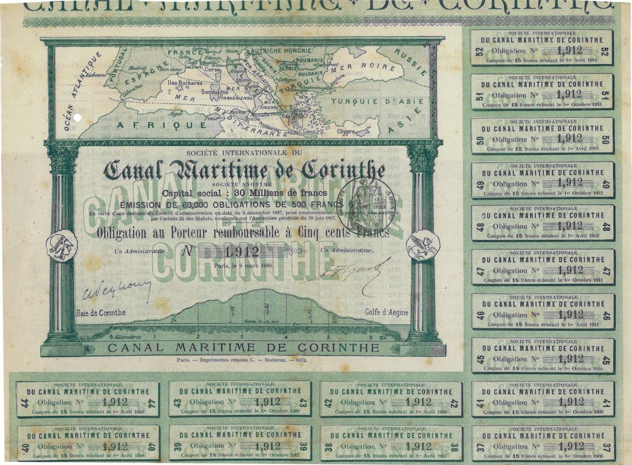 L’istmo di Corinto è un istmo naturale largo solo 6 km tra la Grecia settentrionale e il Peloponneso. Già nell’antichità (ad esempio con Nerone) lo sfondamento tra il Golfo di Corinto e il Golfo di Egina fu pianificato più volte. Nel 1881-82 lo iniziò la Soc. Internationale du Canal Maritime de Corinthe S.A. con la costruzione del canale. La Soc. L’Hellénique du Canal de Corinthe continuò i lavori dal 1890 dopo che la società precedente rimase senza soldi. Il canale è stato aperto nel 1893. La successiva compagnia di soccorso fu Nouvelle S.A. du Canal de Corinthe poco dopo il 1900.
