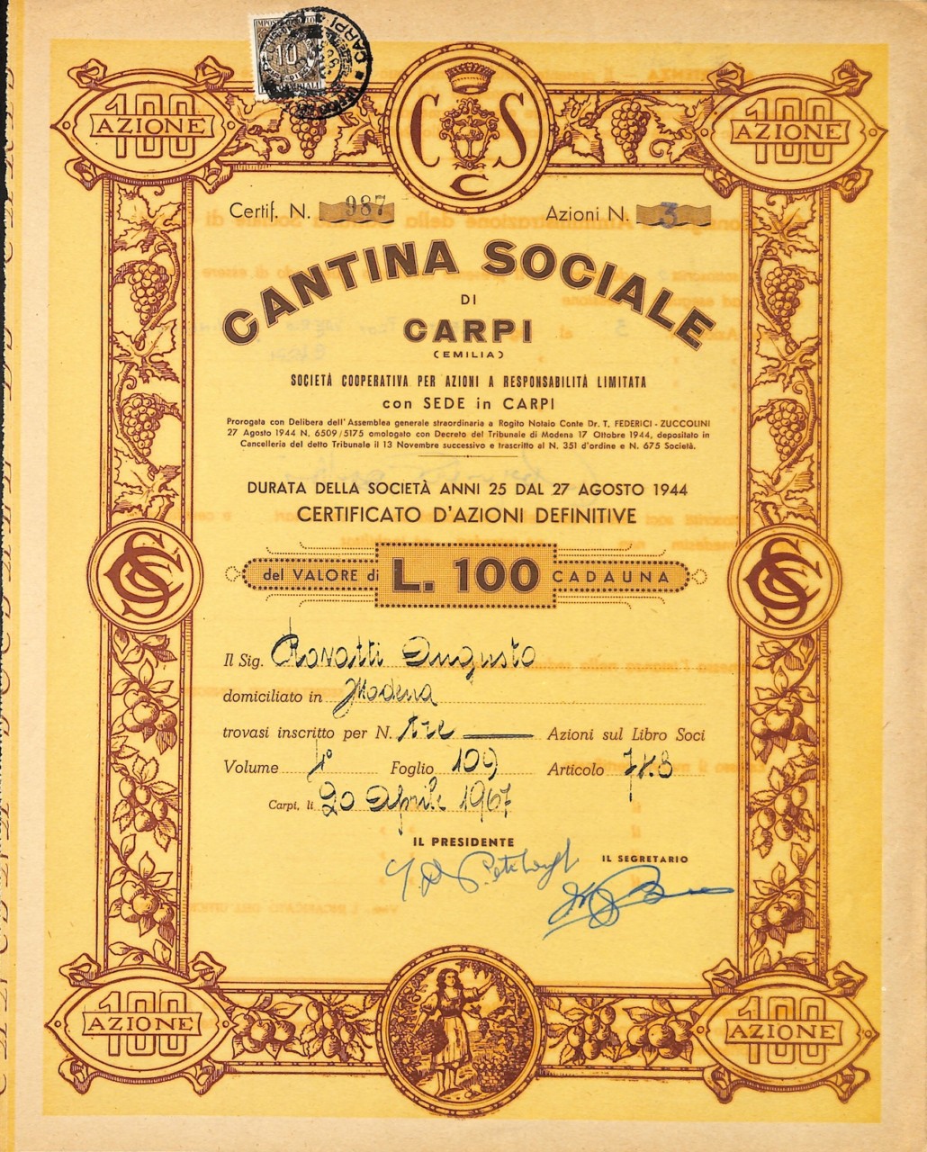 Cornice decorativa con grappoli d’uva e altri frutti, marchio della cantina in alto, fanciulla intenta alla vendemmia racchiusa in un medaglione in basso.