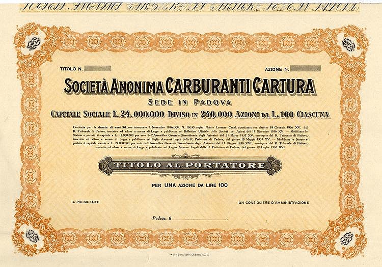 A-38049Carburanti Cartura S.A.-1Padova1938Azione al portatore non emessa da Lire 100R1 (Più di 5000 pezzi)S1 (da 0 a 25 €)