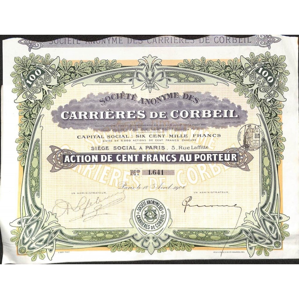 A-46992Carrieres de corbeil soc. Anon. Des-1 Parigi1908100 FranchiR1 (Più di 5000 pezzi)S1 (da 0 a 25 €)