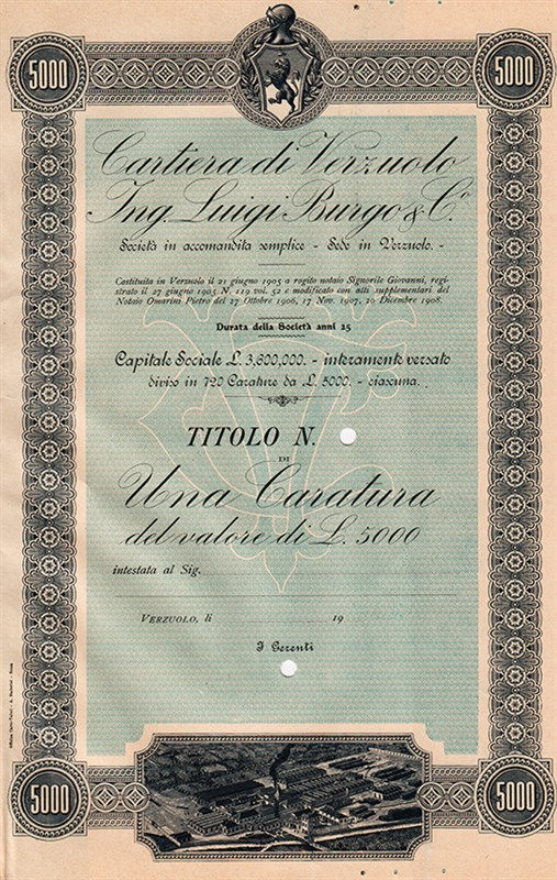 A-53597Cartiera di Verzuolo Ing. Luigi Burgo & C.-1Cuneo19081 caratura da Lire 5.000R3 (501-1000 pezzi)S2 (da 26 a 50 €)