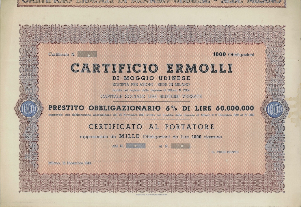 A-12715Cartificio Ermolli-1Officina Carte Valori Turati Lombardi e C. - MilanoMilano19491000 obbligazioniR2 (1001-5000 pezzi)S2 (da 26 a 50 €)