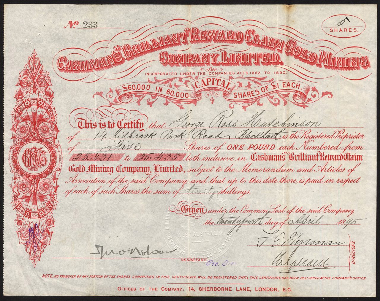 Cashman’s “Brilliant” Reward Claim Gold Mining Company Ltd