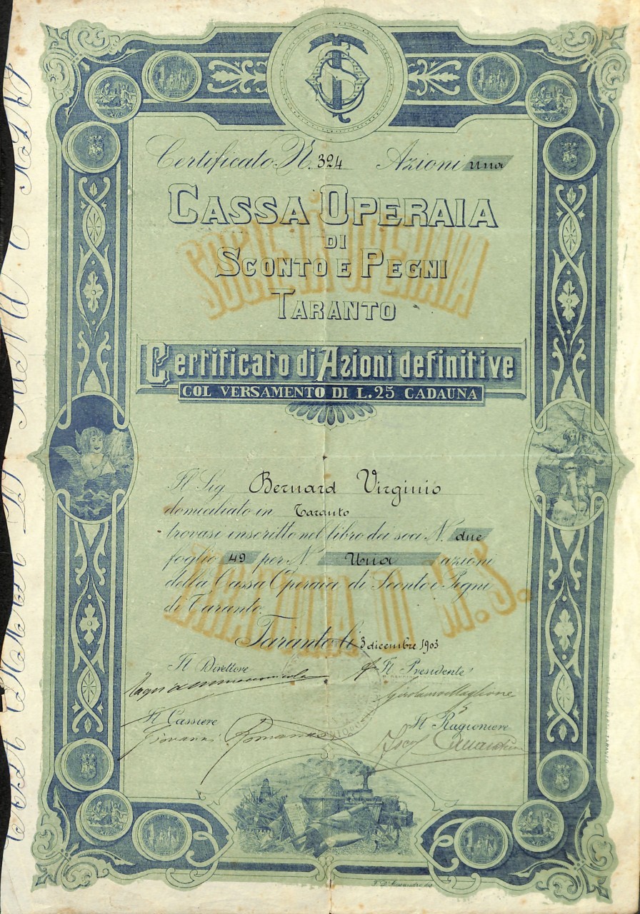 B-6319Cassa Operaia di Sconto e Pegni – Taranto-2-Taranto1911Azione nominativa cumulativa da Lire 25R3 (501-1000 pezzi)S4 (da 101 a 250 €)