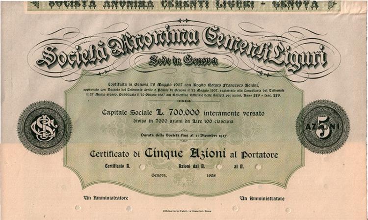 Profilatura dai tratti sinuosi di ispirazione Liberty, logo del cementificio creato a Genova nel 1907. Proprio la prima decade del XX secolo vide la nascita e lo sviluppo in Italia, soprattutto nel Monferrato piemontese e in Liguria, dell’industria cementiera per trasformare il calcare e la marna estratti dalle cave in calce, cemento e derivati.