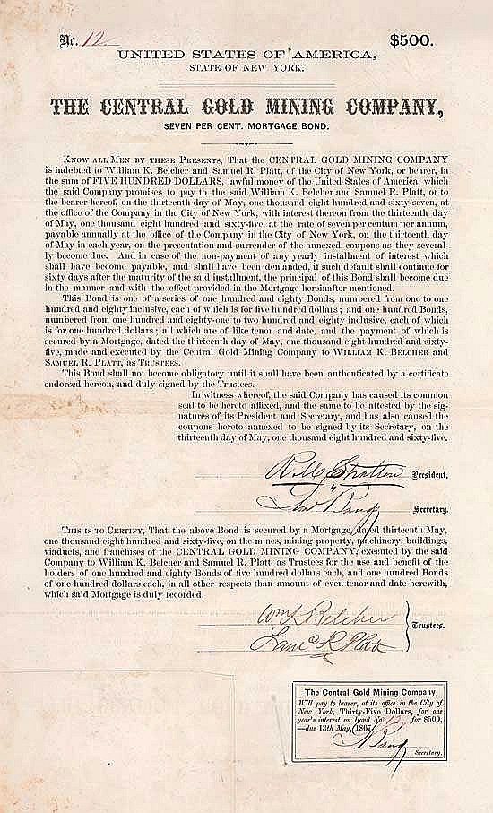Miniere d’oro a Central City, Colorado. Il capitale era di $ 1 milione. La Compagnia aveva crediti in Rhoderic Dhu, Prize, Gunnell e Gunnell East Grunell Extension. Il sito della fabbrica era a North Clear Creek, mezzo miglio a est di Black Hawk, tra New York e Kenyon GMC sulla strada principale di Denver.