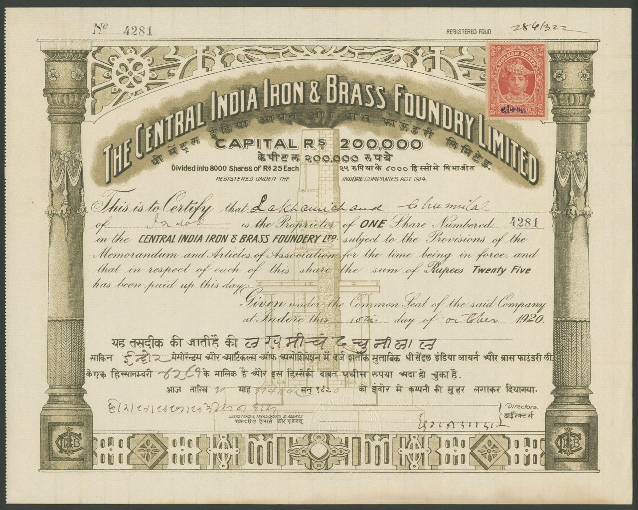 Incorporato ai sensi della Indore Companies Act del 1914. Capitale 200.000 rupie in 8.000 azioni di 25 rupie.
