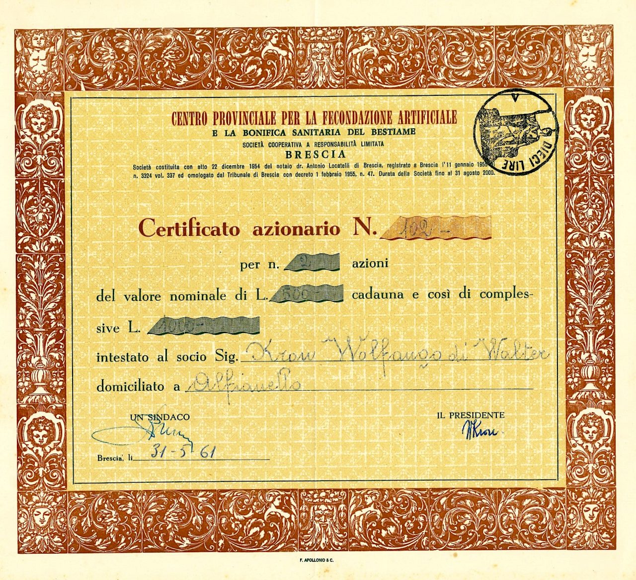 Il certificato azionario analizzato, emesso il 31 maggio 1961, attesta la proprietà di azioni con un valore nominale in lire, intestato a un socio specifico e registrato negli archivi della società.